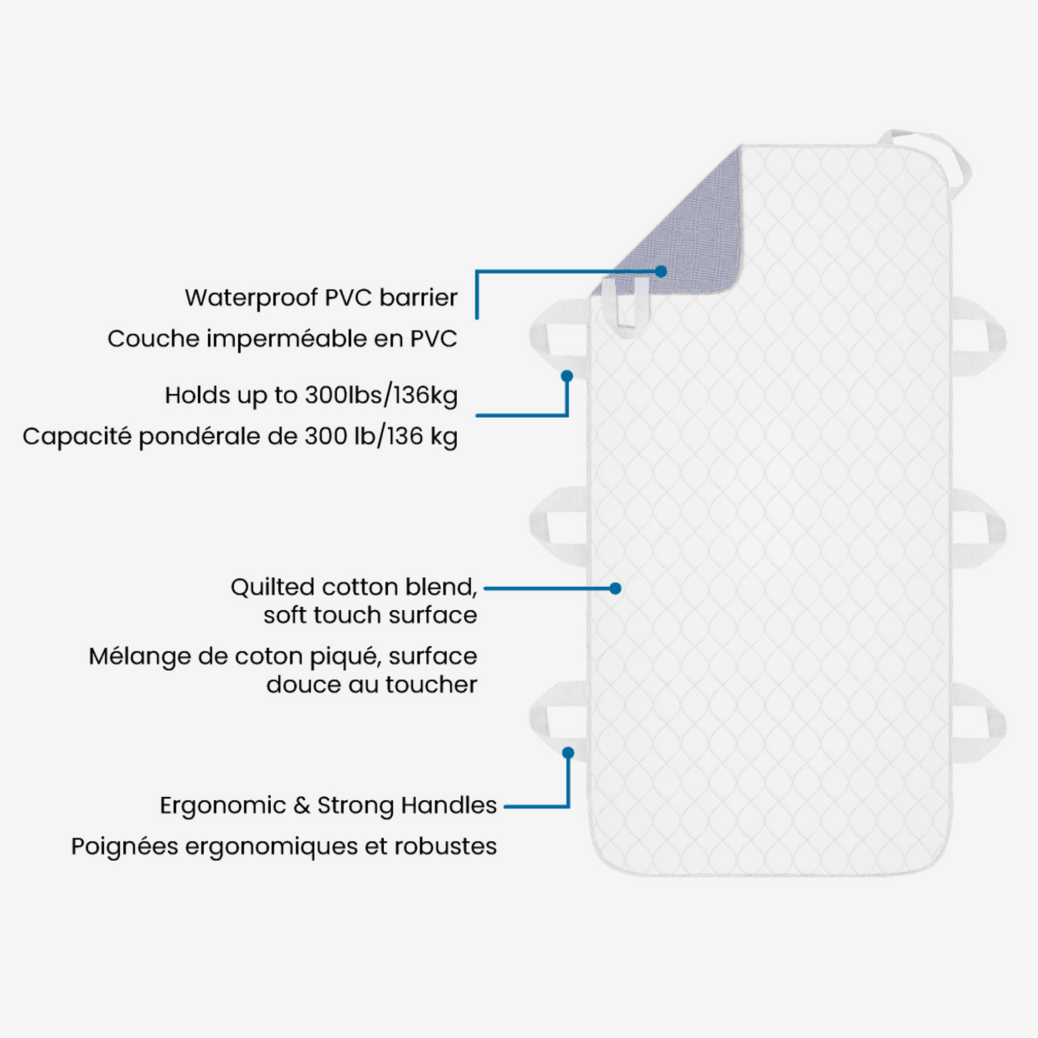 - Les 6 poignées durables et renforcées sont faciles à saisir et elles permettent de repositionner, tourner, asseoir et soulever le patient sans effort.